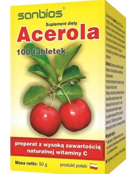 Suplement diety Acerola zawiera 25%-owy wyciąg z owoców aceroli będącej jednym z najbogatszych na świecie źródeł naturalnej witaminy C.