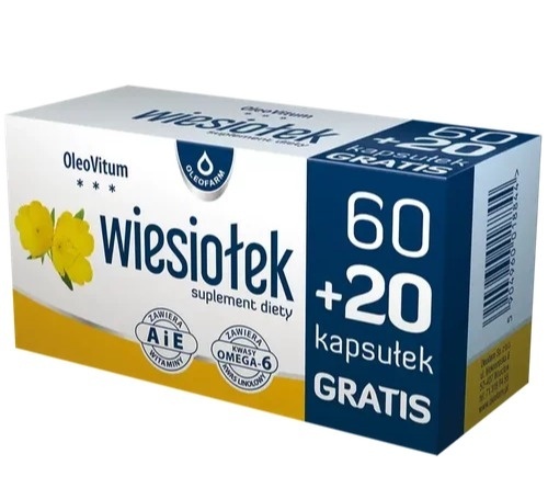 Olej z nasion wiesiołka 1000 mg, w tym: 840 mg wielonienasyconych kwasów tłuszczowych, z czego 830 mg kwasów tłuszczowych omega-6, z czego 740 mg kwasu linolowego oraz 85 mg kwasu gamma-linolenowego, 6 mg ekwiwalentu alfa-tokoferolu – witaminy E (50%*), 200 µg witaminy A (25%*).