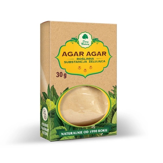 Agar-agar uzyskuje się z wodorostów. Jest to naturalna substancja roślinna zastępująca żelatynę. Jest od niej dużo zdrowsza i wydajniejsza, zawiera 80% błonnika. Nie ma koloru, smaku ani zapachu, nie psuje więc cech przygotowywanych potraw.